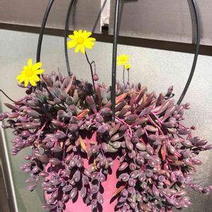 ルビーネックレスにも花が咲きました😄 フリマサイトで多肉を買った時にオマケで頂いたカット苗です。 根付いくれたみたいで嬉しい😊 後ろの赤は以前カットした天狗の舞。 リメ缶に一緒に植え付けてます。 こちらも根付いたようです☺️