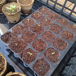 自家採種したパンジー・ビオラの種を水に浸して待つこと数日。発根した種を植え付け、ちょうど一週間になります。 ひとマスに、ひとつずつとしたつもりが、2つの🌱が出ているところも。 大雑把な性格が出ました😅