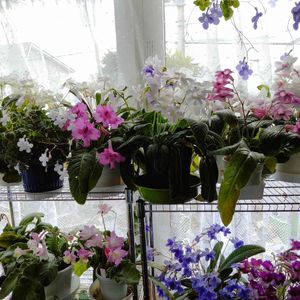 ストレプトカーパス勢ぞろい(一部) 葉焼けするのでレースのカーテン掛けっぱなしで、庭が見えないのもストレスです。