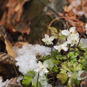 横にスライドしてくださいね 出会いたかったお花その5 ヒュウガオウレンとバイカオウレン ①枚目の上2枚と②③ ヒュウガオウレン✨ バイカオウレンよりも小さい萼片 茎が赤味がかっていました ここの葉っぱは銅葉のようでしたが ネットでみるとヒュウガオウレンの葉も緑のが多かったです ①枚目の下2枚と④⑤ バイカオウレンCoptis quinquefolia✨ (コプティス クウィンクェフォリア) キンポウゲ科オウレン属 和名は、花の形がウメの花に似ているという意味 種形容語のquinquefoliaとは5枚の葉という意味で この植物が5枚の小葉を持つことによる オウレンは、漢字で黄連(huánglián)と書く その意は、黄色く連なった地下茎のこと この属の根茎には、抗菌作用のある アルカロイドのベルベリンが豊富に含まれている 中国産のシナオウレンCoptis chinensis、 キクバオウレンなどのCoptis japonicaは、 伝統的な中医薬、日本では漢方薬の原料にされてきた 花が咲き終わるとすぐに 子房が袋状に膨らんで果実となる それを袋果と呼び車輪状に突出する この袋果をよく見ると、外側の先端に穴が開いていて 種子が成熟したら風に揺れて 少しずつ種を放出する仕組みのよう キンポウゲ科にはよくあるが 花弁と思っていた5枚の弁はがく片である 花弁は黄色のさじ状になった蜜標 雄しべ、雌しべは多数 花を構成する各器官の数は花によって違う セツブンソウの花構造に似ている バイカオウレンの種形容語のquinquefoliaは 5枚の葉という意味 この植物の葉は、常緑で硬く5枚の小葉を持つ複葉 オウレン属は、葉の形状にも特徴があるのでこの葉を覚えておくと植物の鑑定に役立つ とのこと 可憐な姿で健気に咲いていました 2024.3.10撮影 🏷️白い水曜日♡ 🏷️白い貴婦人✨ 🏷️白輝美人 🏷️スライドショー♪ 🏷️復興を祈る 🏷️復興祈願 🏷️花友さんに感謝♡