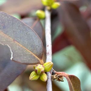 おはようございます アプローチ隅の白花鶯神楽… 先日の小さなポチッが 緑になって来ました この木は斜面の自生のピンクの木(ヤマorミヤマ鶯神楽)と違って昔私がお迎えした園芸種ですが お名前を暫くの間ウグイスカズラとばかり思ってしまっていました スイカズラ科ウグイスカグラ属 斜面のピンクの場所までなかなか会いに行けなくなっているので こちらを楽しみにしています お花は4月 5月にはピンクの鶯神楽の赤い実と違って黄色くて甘い実が! 📝 鱗芽は 長さ2mm〜4mmの卵型で対生 芽鱗は1〜2対 鱗芽は2〜4枚で薄く淡褐色〜黄白色で無毛 頂芽はやや大きく卵型 葉柄が残るので葉痕は見られない 徒長枝に葉柄の基部が広がり 対の葉柄の基部と合着した鍔ツバが残る