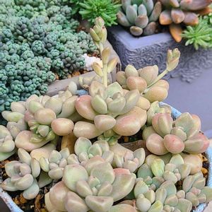 グラプトペタルム だるま姫秀麗 R5年1月18日購入 JA 姫秀麗とだるま秀麗のハイブリッドかと思ったら、姫秀麗のだるまバージョンらしい。 よく分からんけど。 花芽出てるから何かと交配したいなぁ😊 200ペソ