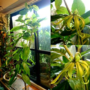 『イランイラン』第2段! 購入時は腰上位だったのが、いつの間にかサッシ上枠まで届くサイズまで成長してます。 (栄養足りないのかヒョロヒョロ〰…😰😓) 花も大きくなり徐々に黄色くなってきた〰😁