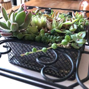 従姉妹から預かった お洒落なアイアンススタンド✨ 🔰なので… とりあえず、 横に倒して〜 穴のない容器に見立てて 多肉寄せをしてみました💓 このまま、 根づいてくれるといいなぁ〜💕 レッツ‼︎ チャレンジ!! ファイト (^O^☆♪💕🍀 穴がない鉢に見立てて チャレンジ中〜⤴️ (((o(*゚▽゚*)o)))♡🎶💓