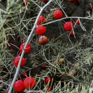 実は雌株にでき 熟すと赤くなります🔴 ③④淡黄色の釣鐘型の小花 花径は1cmにも満たない😹 アスパラガスの果実と花 ユリ(キジカクシ)科