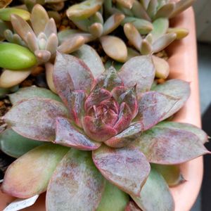 いや〜またかなり空いてしまいました🥲 多肉熱が冷めたという訳でもないけど、そうゆう感じも否めないけど、まだまだ欲しい欲はあったりもしています😅 写真は、ナンバーワン。 4月ごろがもっと濃くて素敵だったのに、写真撮っていませんでした この子は子吹きもするようで、春にカットして寄せ植えに使いました♡