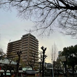 今朝の阪急電車十三駅前の神津神社⛩ 今朝は京都より大阪の方が冷え込みが強かったです😢🥶 桜の木の枝はまだまだつぼみ堅し😥