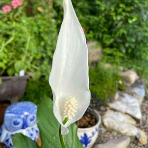 スパティフィラム? 名前不明で頂いたのが咲きました。 白い花が涼しげ