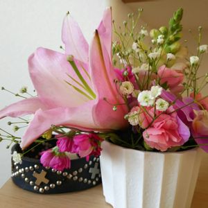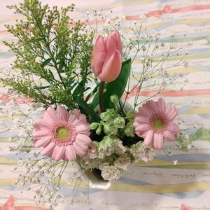 今日は、お友達がメモリアルフラワーを持って遊びに来てくれました😌🌿 ありがとう~😌🌿 💗ピンクのガーベラ、チューリップがとっても可愛いです😌🌿