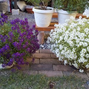 スーパーアリッサムフロスティーナイトとパープルプリンセス🎵 親株は残念ながら大寒波にやられてしまい枯れてしまったのですが、挿し芽ちゃんたちが無事残ってくれたので普通の鉢に植え替えました☺️ 成長はまだまだですがいい香りはしてくれています😊