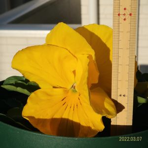 黄色のパンジー・パシオさん 二輪目が咲いたので、構造をチェックしました。 花弁は差し渡し 65mmほど、左手の普通サイズのビオラさんと較べるとだいぶ大きいです。 めしべの穴を確認しました 直径1.5mmほど パシオさんでもこんなに小さなターゲット 交配できるかな?? はっ!? お父さんがまだ登場して来ませんね (^^ゞ