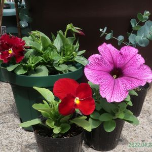 GSのみなさん こんにちは パンジー パシオミックス 二つ続けて エンジ色さんが来ました ペチュニア バカラミックス 薄ピンクと薄黄色の交配 あらっ !! プラムちゃんが生まれちゃった!! もしかして バカラのラビリンスに迷い込んじゃったかな 前の二株 鉢上げしました 汗だく もう夏かぁ!? みなさんもお元気でお過ごしくださいね