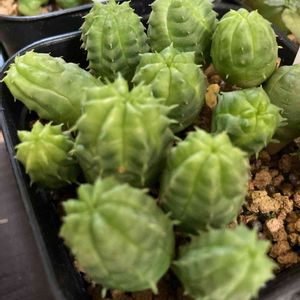 🏷️みしょり隊 こんばんわ! うちのそっくりさん 赤ちゃんユーフォルビアたち ↖️オベサ梵天オベサ ↗️グロボーサ ⬇️オベレオン… 先日教えていただき 交配種は雌株の名前を先にするらしい なのでオベレオンだと逆だな💦 カメレオンヘルメット&オベサ いい名前ないですか?💦 改名希望です😅