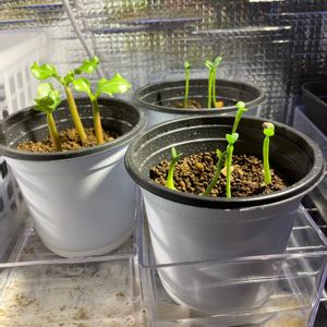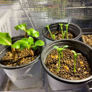 みんな双葉🌱が開きました😊 ところで、カメ×オベなんですが、発芽してすぐはこんなに伸びるものなんですかね〜😟