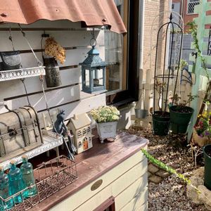 こんにちは😊 室外機カバーの上にdiyした ディスプレイコーナー🥰 アナベル、山紫陽花、薔薇… 色々カットしてランプを灯すと 可愛い雑貨コーナーに💕
