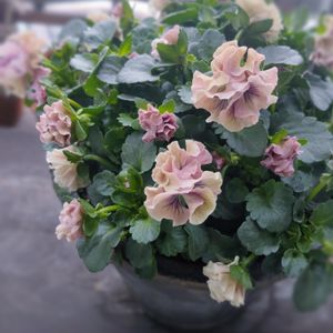 こんばんは 白い縁取りが可愛い 🏷無しで12月下旬にお迎えしていたビオラさん ピンクの寄せ植え ビオラ シフォンピーチだいぶ咲いてくれました 色濃くなって変化してます✨ プリンセスクローバーも上手く調和して良い感じ😘💕