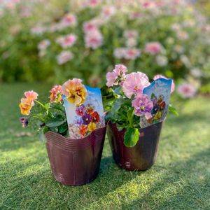 ミルフルと天の羽衣の寄せ植え ミルフルはアンティークフリル(ビオラ) 奥の少し濃い色のが天の羽衣(パンジー)です。 かわいく出来ました。