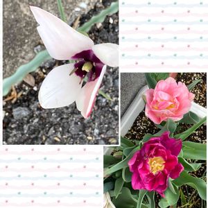 背丈が低い八重咲きチューリップと原種チューリップペパーミントスティックがきれいに咲いていました。