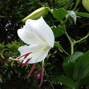 😊💕待ちに待った🎵 カサブランカの花が 雨の中😉👌咲いてく れました💕 花が重くて下を向いていたので🤔朝顔の支柱で支えてます😍