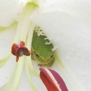 おはようございます😊♪ 雨上がりの裏庭で カサブランカが咲いてる(^-^)! と📲で撮りに近づくと ❓️…花の奥が緑色??? ズームアップして見たら🤗 小さな小さな アマガエル🐸ちゃんが 咲いたばかりの カサブランカの中で、 雨宿りしていました(^-^)💕。 今日も素敵な1日で ありますように✨✨✨✨✨。