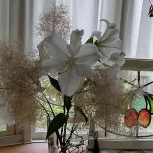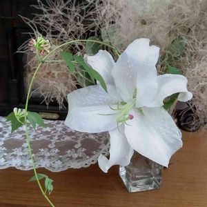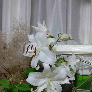 おはようございます😊♪ 庭のカサブランカをもう一度 見に行くと、🐸ちゃんの姿は 無く、雨宿りしていた花は 雨で傷んでいました。 このまま雨のなか萎れてしまうのは忍びなくて、 切り花にして、 シャガの葉を添え 玄関に入れました。 普通百合を生ける時は 花粉で汚れるので 雄しべを取ってしまうのですが、 ずっと思っていました… 雄しべの無い百合は 印鑑のない証書?眉の無い顔? のよう…なんて例えが変でしょうか😅。 と言うことで、 今回雄しべに ハードタイプのヘアスプレーをたっぷり吹き掛けてみました🤗。 これで花粉で汚れる心配が 無くなれば、大成功🎉❗️ 経過観察してみます😊✨。 今日も素敵な1日と なりますように✨✨✨✨✨。