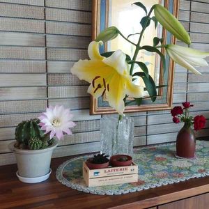 今年、初めて1本だけ咲いたカサブランカさん、黄色のお花でした!植えたのは白?だったような気がしてますが!サボテンさんも又、咲きました。大きさ分かりますか?比較するのに多肉さんも置いてみましたが。