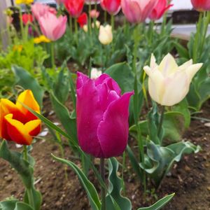 散歩コース、… やっぱり、ここのお宅👵のお庭を見せて頂いて、Uターン❣️ 今は、この可愛いチューリップ🌷畑の成長を見せて頂くのが楽しみ〜 あのふくよかなピンク薔薇も若葉がフサフサ〜 チューリップ🌷楽しい🎶来年こそワタシも植える♪