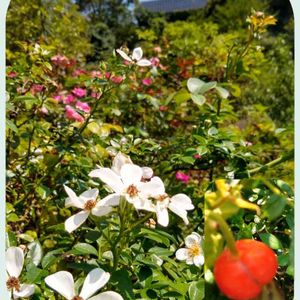 ノイバラ(ノバラ) バラ科 落葉性の低木 品種改良の為の台木として 育てられている事が多い。 花後に右下の赤い実が なります。「営実」と言われ 便秘や利尿薬として利用 されるそうです。又吹き出物 にも効果がある優れ物の赤い 実ですね。 花言葉『素朴な可愛いらしさ』 『素朴な愛』 モネの庭の花の庭に咲いて いました。💓