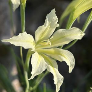 無人の岡山の実家の庭を 気にかけて下さっている 花友さんから花便りが 届きました♪ 昨秋に株分けしてもらった 早咲きのグラジオラスが 開花しました💕 原種系グラジオラス トリステスコンコロール 夏咲きのカラフルでゴージャスな グラジオラスとは趣が全く違って 茎も葉も細い 淡〜い黄緑っぽいクリーム色 可憐で原種的で 思った通りだわ🥰 直接見られなのは残念だけど😢 嬉しい😊咲いてくれてありがとう💖