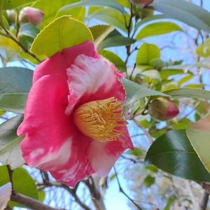 椿・令和物語 茶化の女王編 一頁 大虹(おおにじ) 紅色地に白斑が入り、 八重咲きの極大輪。 2022/03 上旬