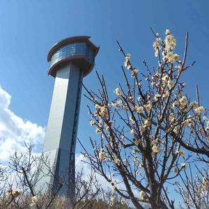 白梅・令和物語🤍🤍🤍 十頁@古代蓮の里 白梅と展望タワー(地上50mで有料400円)。 展望タワーの形は 蓮の花をイメージしているとの事。 展望タワーは行かないで 饅頭を買ってパクりんこ(^^)www