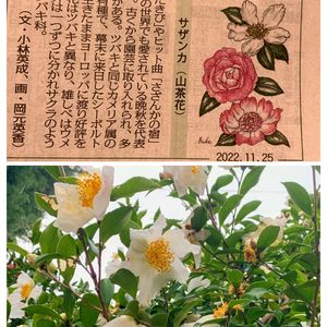 本日2枚目 今日の花 サザンカ゚*.。. まさか、偶然 (*´艸`*)!! 毎日 ロ-カル新聞に 連載されている 「 レッツ!植物楽(がく) 」 との言うコーナーがあります。 今日GSと一緒の まさに サザンカ(山茶花).* ⚘!! 朝散歩より 真っ白な サザンカ 🤍𓂃𓂂🍃