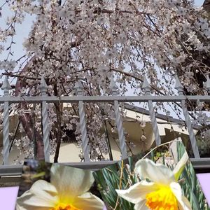 🌸枝垂れ桜と水仙🌿 今日は あいにくの 雨☔️ 昨日 撮っておきました✌️ 雨☔️で 早く 散りそう🌝🤔🤗