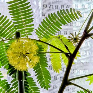 たま〜に行くイオンのお店で🎶 西陽の当たるガラス越しで、暑そうな⁈ …空気が乾いて可哀想だわ〜と思っていたので、近づいてみた‼︎ 何と、思ったより幹が太く大きな木は大胆剪定されていた🌴 そして可愛いポンポンの花が😍🟡🟡🟡 もうちょっと若い木が隣にもう1本ありました🌴