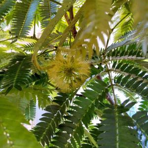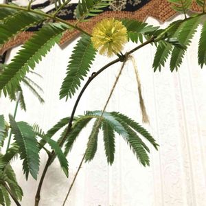 大きな木にたった一つ花が咲いていました。 エバーフレッシュの花、とても涼しげです!