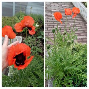 オニゲシ「鬼芥子」 5年ほど前に、お向かいのおばあちゃんから頂いたケシの種!! 昨年は、3個咲き今年はナンと16個も蕾が有ります😳 大きな花で、開くと私の手が隠れます。今は中開きですね.。*・゚゚*☆