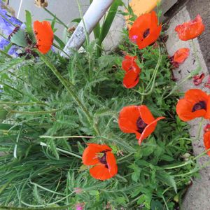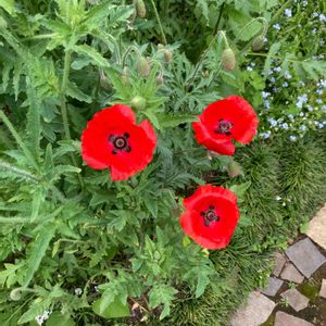 里山に行く道の両側はいつも地元の人が花をたくさん植えてくれてます 今年もオニゲシが咲いていました 植えても良いオニゲシ ・鳥の羽のような(羽状)切れ込みがある ・花の真下に苞葉があることがある