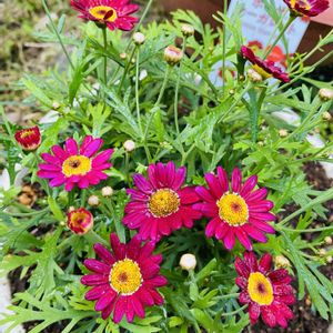おはようございます😊 ボンザマーガレットチェリーが咲き始めました🍒 先に咲いているルージュピンクも可愛く咲いています。コスモスピンクはまだ蕾です💕