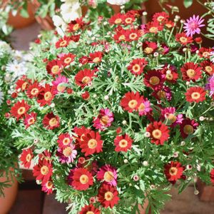 ボンザマーガレット イチゴショート🍰チェリー🍒 鉢から葉が溢れるぐらいになってきました✨ お花も次々咲いています。