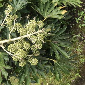 ヤツデ ウコギ科ヤツデ属 昨年初めて咲いて、秋から冬にかけてのお花がなくて寂しい庭で、一人健闘してくれました🍀 様子を見守っていましたが、この度、黒く完熟して、新しい🌿が、出て来て世代交代を知らせてくれました🤗🤣。 🐦さんが、食べに来る可愛い姿もちらほら見られるようになって😅。指で潰してみると、まるで、デラウェア🎵。我が家の庭では、ハンター🐱が、いるので、切ることに😁。 また、来年お願いします🎵