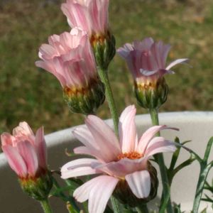 こちらは、玄関横の鉢植えコーナーの一部です 見切り品再生中のマーガレットがきれいに咲いてきました🥰