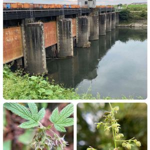 関宿水こう門(こうは門の中に甲を入れた漢字)水量と舟の行き来を調整する門 手前のフェンスにカナムグラの 左 雌花 右 雄花 関宿城寄り橋渡って来る