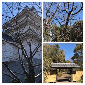 関宿城日本庭園より お城の前は桜 右上は梅 庭園入り口 未だ開花するもの無し 桜とお城楽しみです