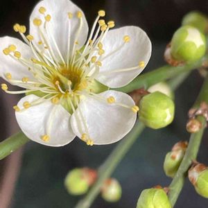 ミントグリーンの蕾から 真っ白な可愛い姿が少しずつ覗き やがて 純白、無垢な満面の笑顔 暖かさが増すと 一面 薄化粧した様に 辺りを ほんのり白く染める 実梅の蕾と花
