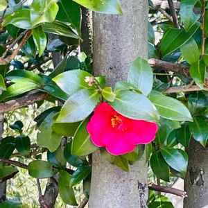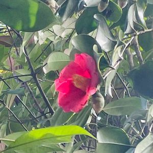 きゃあ〜 恥ずかしい と 葉っぱの影に隠れたつもり 派手色の真っ赤な姿は 目立ちますよ〜😅 グリーンに紅 素敵 一輪だけ 咲いていた 🍃山茶花🌺