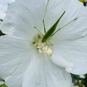 今日のお客様 真っ白なお花な真ん中 独り占め 美味しい蜜のご馳走に 夢中❣️お食事中 お邪魔します📸 体の何倍もある花弁の上って どんな感じなのかな? 一度 体験したいものです🎶 真っ白な 🌿ムクゲ🌿とバッタさん