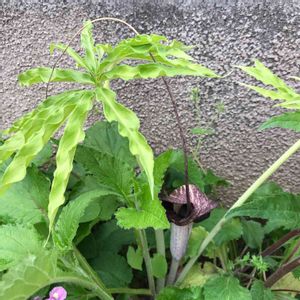 鉢に植えたウラシマソウが開花しました。 黒花です^_^ 緑のまとめにまとめました!