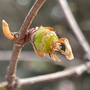 我が家の庭の アカバナマンサク(マンサク科) この万作 花弁が散って残った4枚の萼が まるで小さな花が咲いたように鮮やかです💕