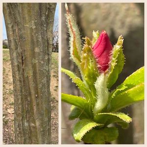 朝🐕散歩 近くの公園の カリン(バラ科ボケ属) カリン属?というのもあり?? 新芽の写真を撮ろうと行ったら 木にくっついた短い枝から花芽が出てる〜 バラ科らしい可愛い蕾ですねー💕 実のように花もいい香りがするのでしょうか? ⬅️木の樹皮はデコボコの筋がありまだらのような模様がありました