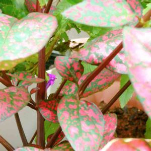 ヒポエステスの花が咲いていました! 茎から直接? 葉の毒々しさとは違ってきれいな紫色の花です☺️